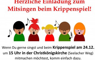Wenn Du gerne singst und beim Krippenspiel am 24.12. um 15 Uhr in der Christkönigskirche (Seelacher Weg) mitmachen möchtest, komm einfach dazu.