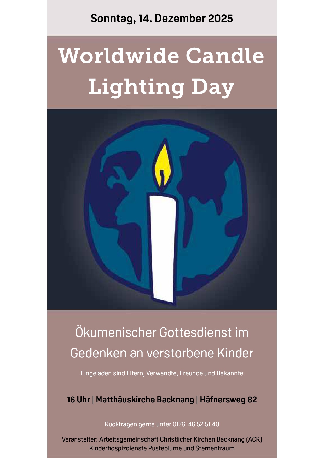 Am „Worldwide Candle Lighting Day“ (14. Dezember 2025) feiern wir in der evangelischen Matthäuskirche (Häfnersweg 82) um 16.00 Uhr einen ökumenischen Gottesdienst zur Erinnerung an verstorbene Kinder.