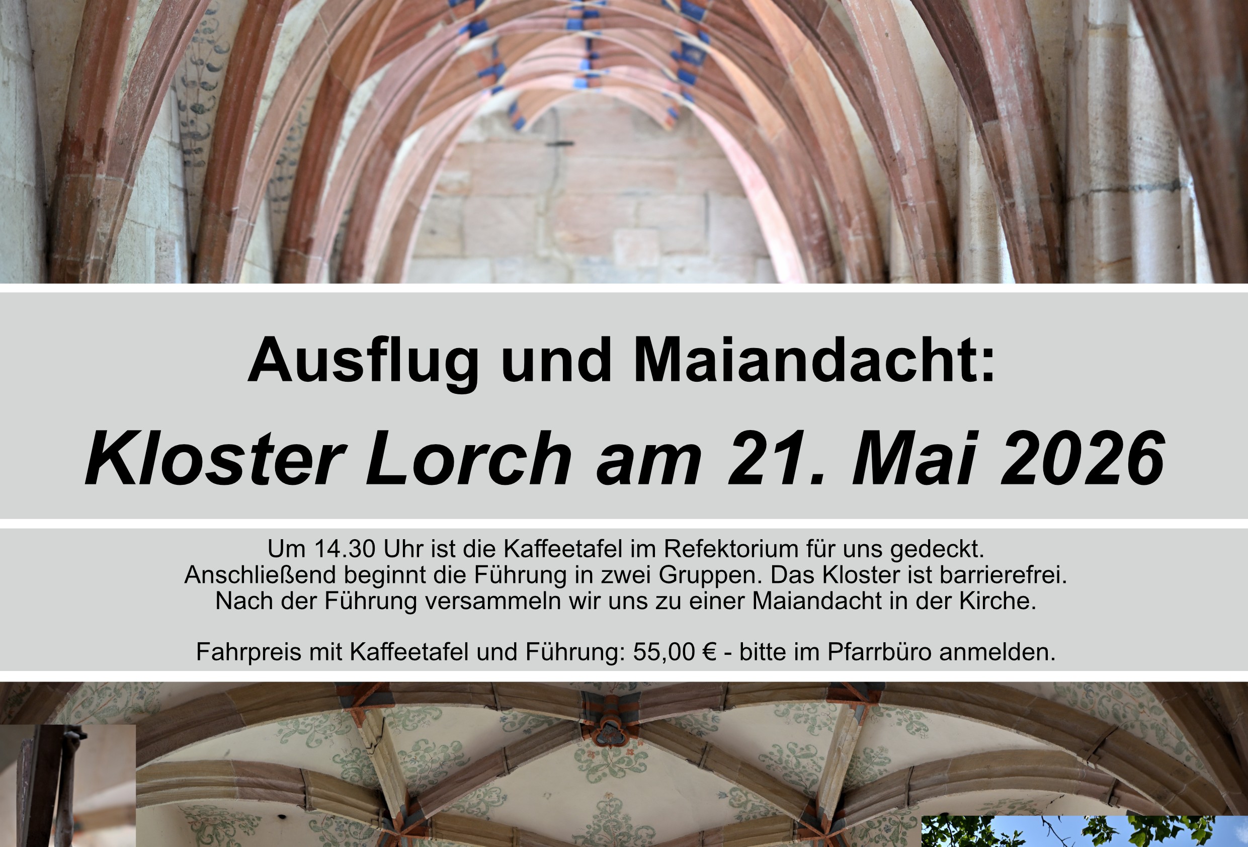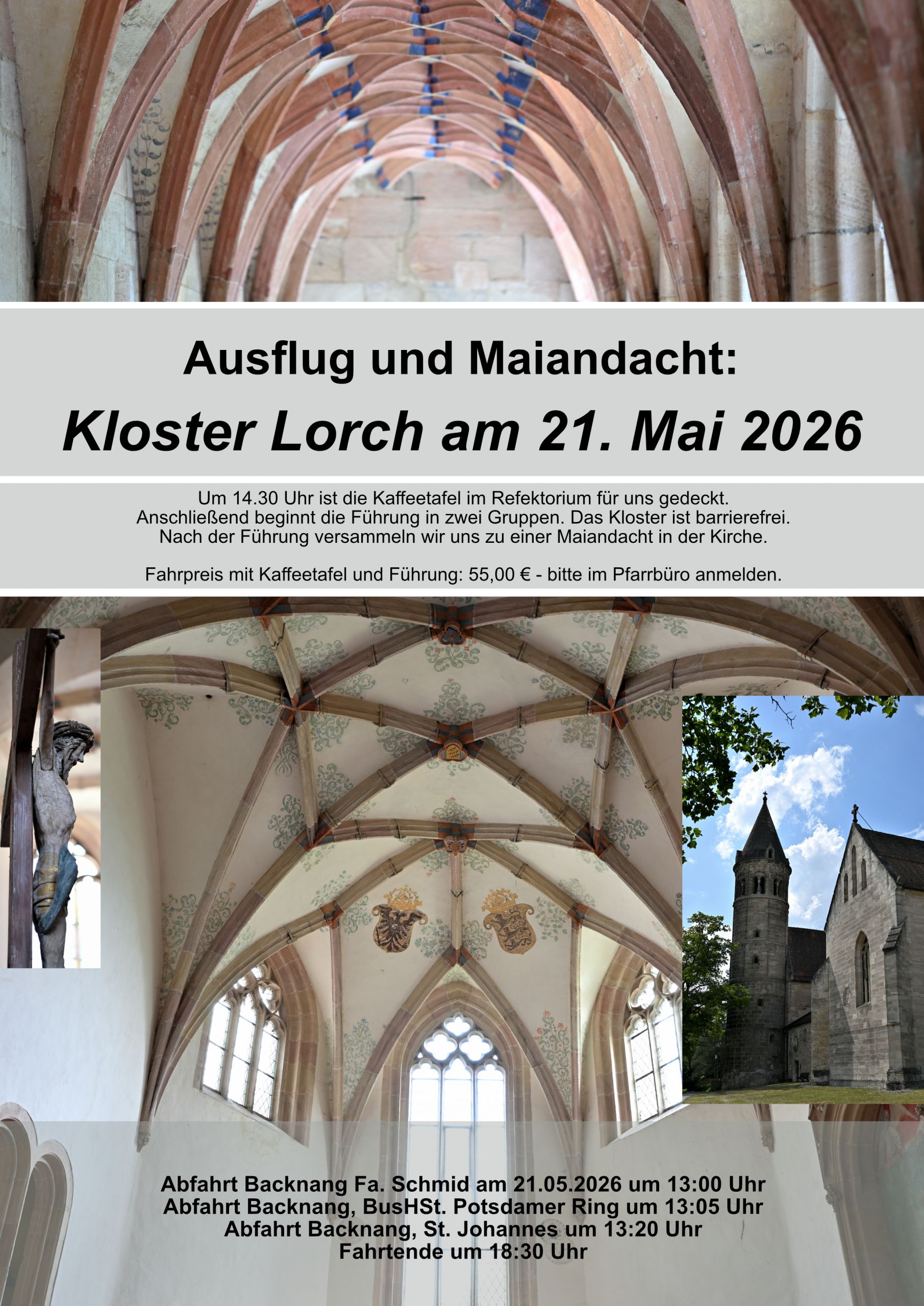 Ausflug und Maiandacht: Kloster Lorch Um 14.30 Uhr ist die Kaffeetafel im Refektorium für uns gedeckt. Anschließend beginnt die Führung in zwei Gruppen. Das Kloster ist barrierefrei. Nach der Führung versammeln wir uns zu einer Maiandacht in der Kirche.