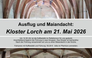 Ausflug und Maiandacht: Kloster Lorch Um 14.30 Uhr ist die Kaffeetafel im Refektorium für uns gedeckt. Anschließend beginnt die Führung in zwei Gruppen. Das Kloster ist barrierefrei. Nach der Führung versammeln wir uns zu einer Maiandacht in der Kirche.