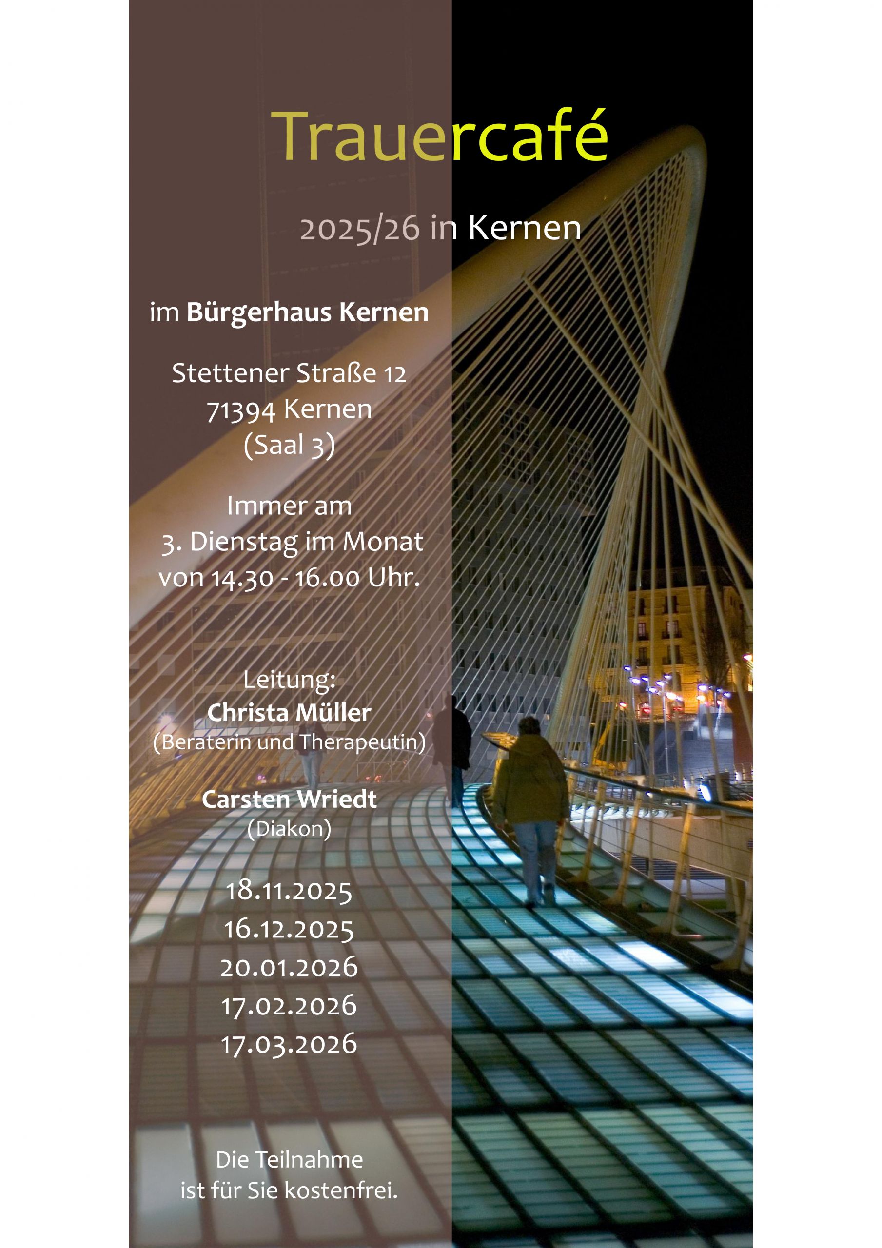 „Trauercafé im Treffpunkt Mozartstraße“: Jede und jeder kann kommen, um in dieser Trauergruppe ins Gespräch zu kommen. Am Beginn steht ein Impuls, der eines der Anliegen von Trauernden aufgreift und mit Erkenntnissen der Trauerforschung anbietet, persönliche Erfahrungen einzuordnen.