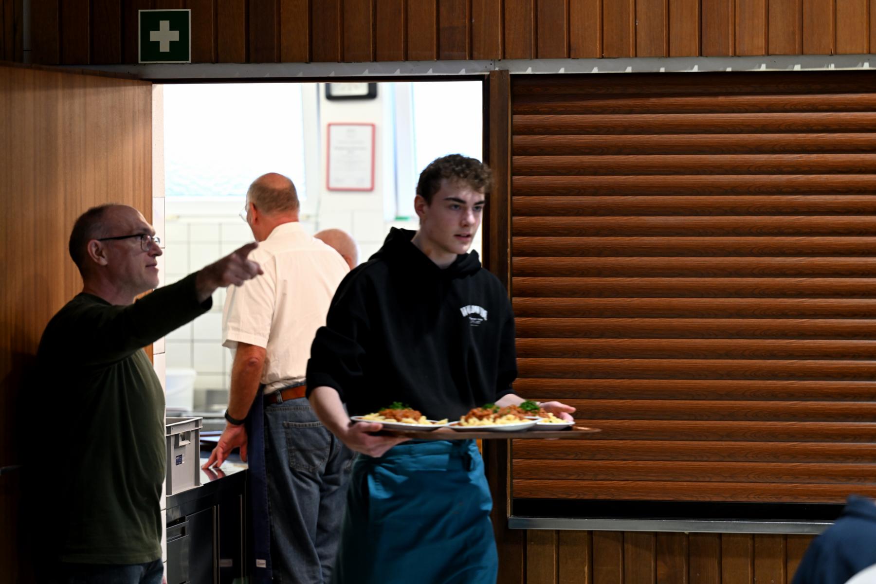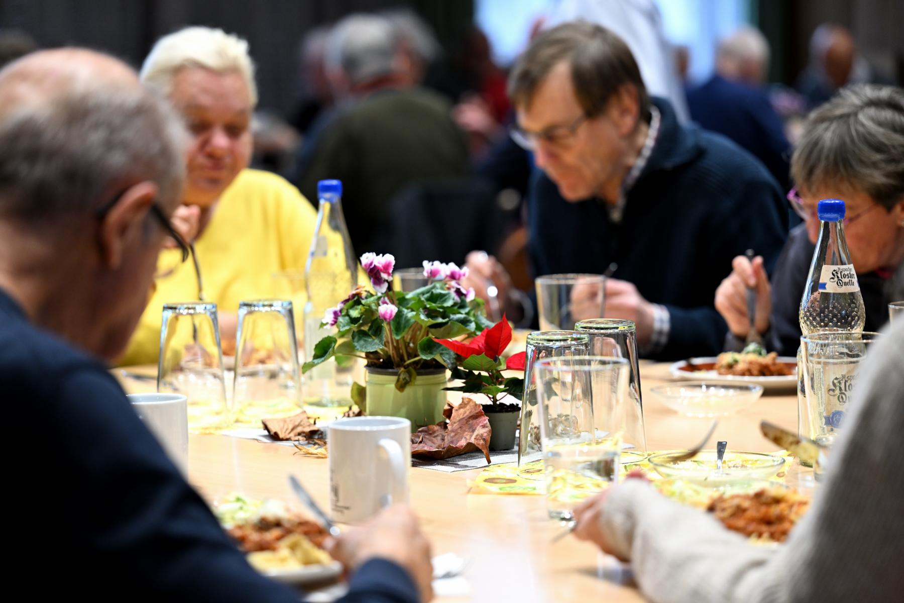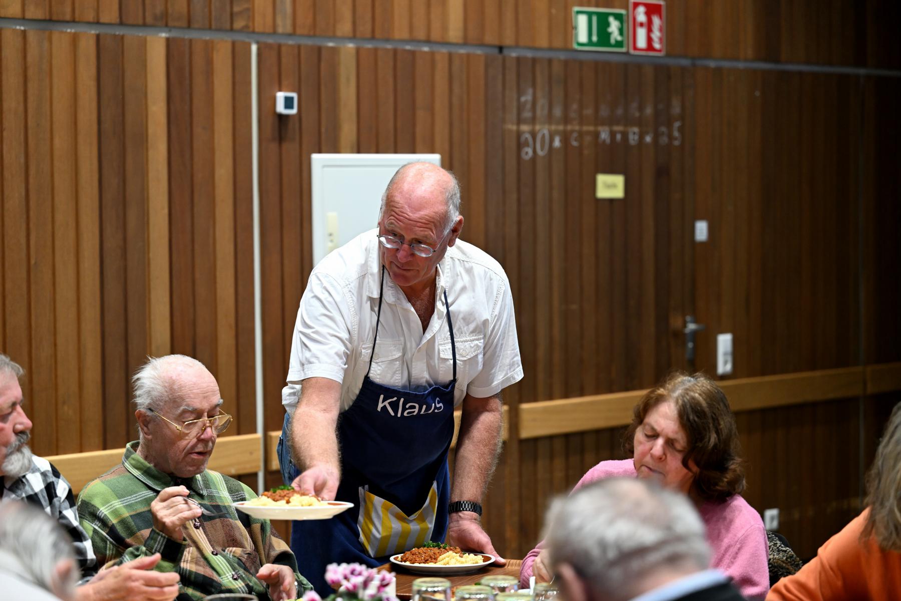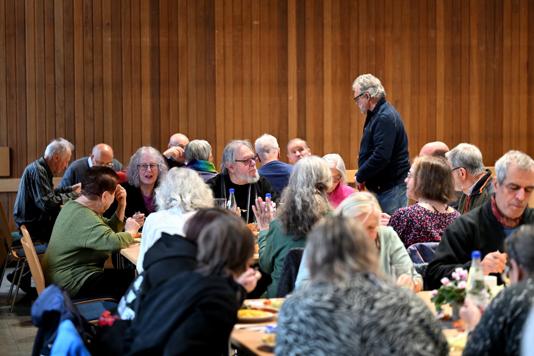 Und dann strömen die Gäste: Der Saal ist voll, das sind schon mal 110 Besucherinnen und Besucher (mit manchem „Nachschlag“ braucht es dafür ca. 150 Essensportionen), einige von ihnen warten, bis ein Platz frei wird.