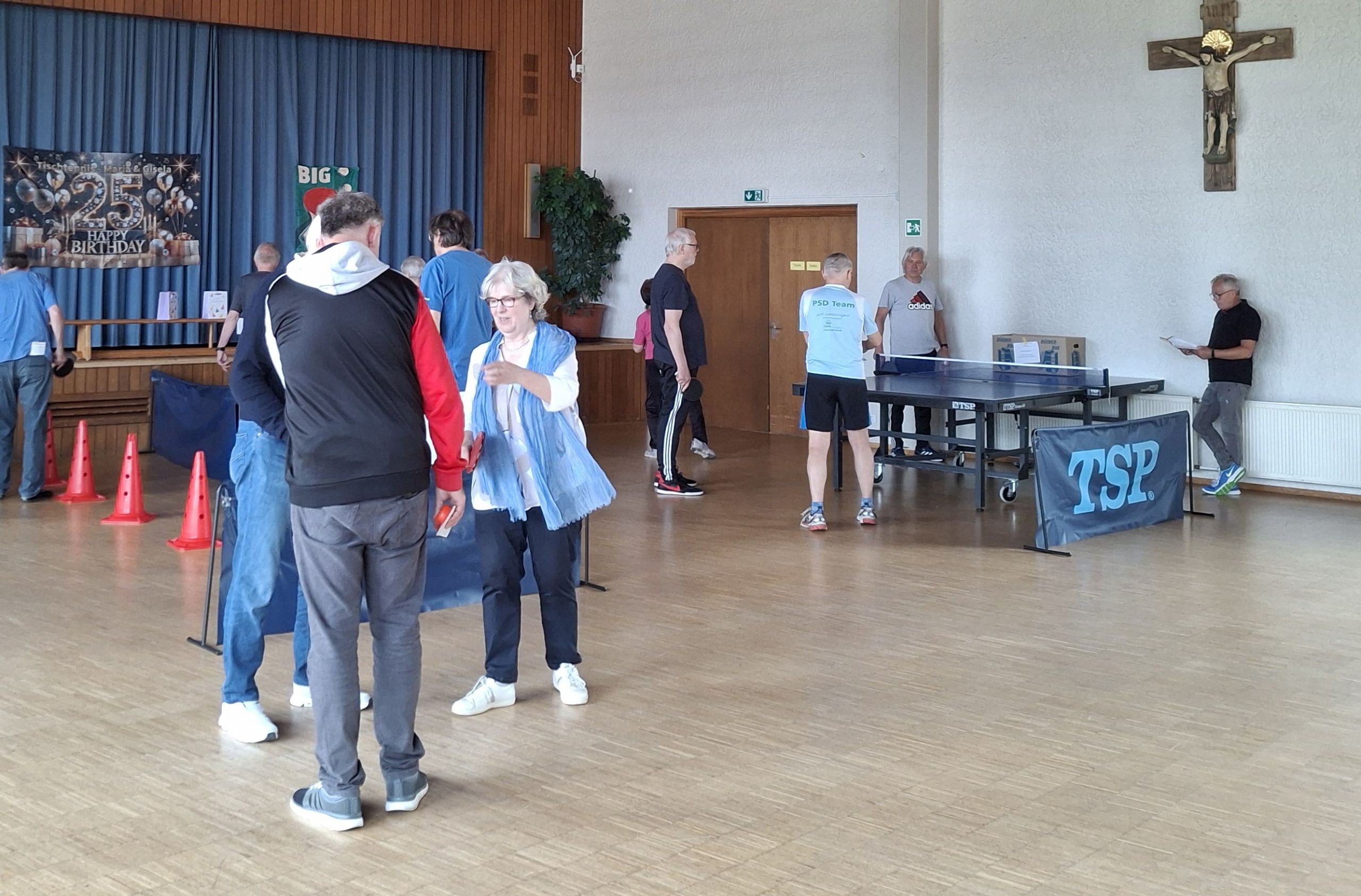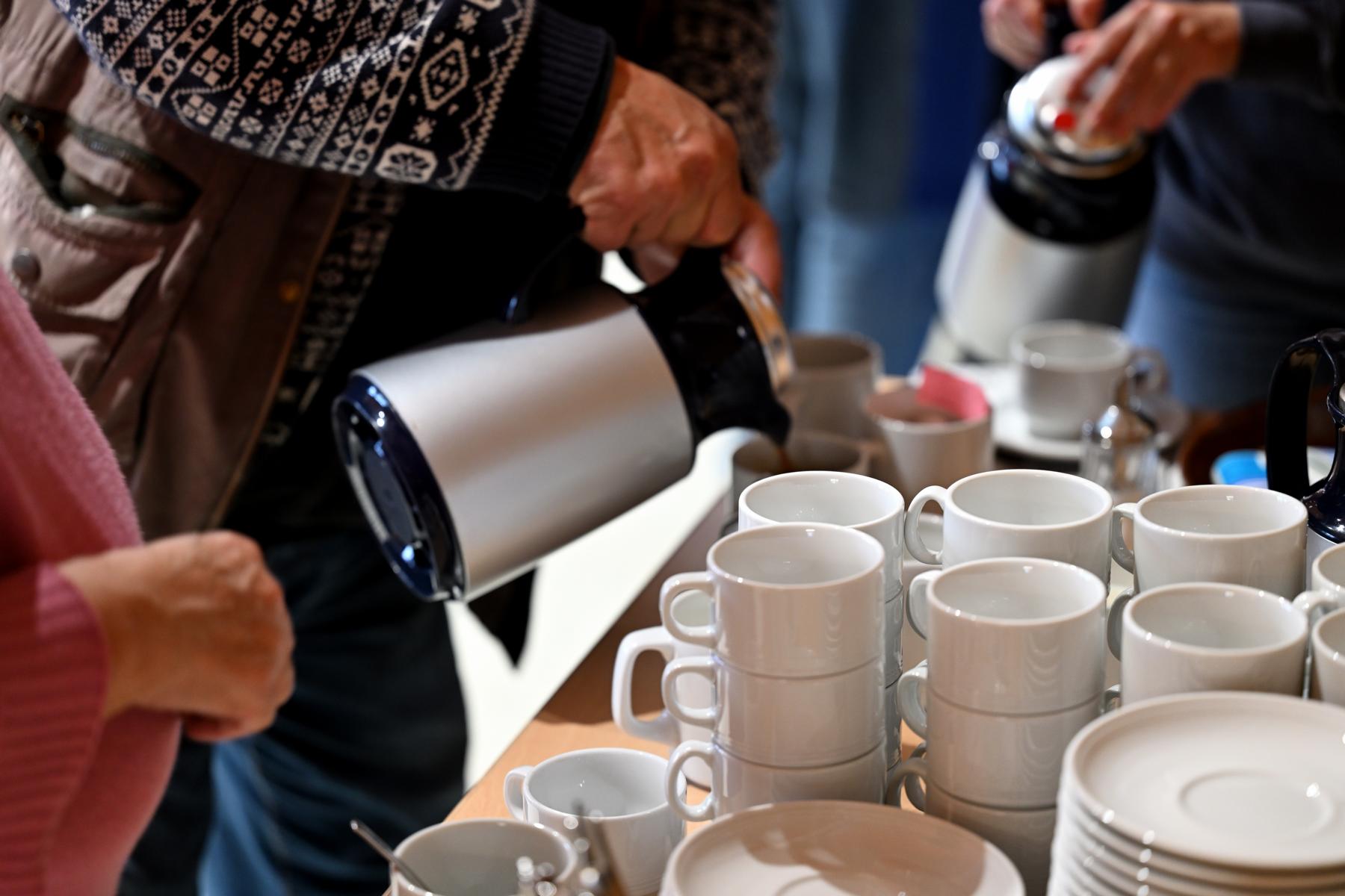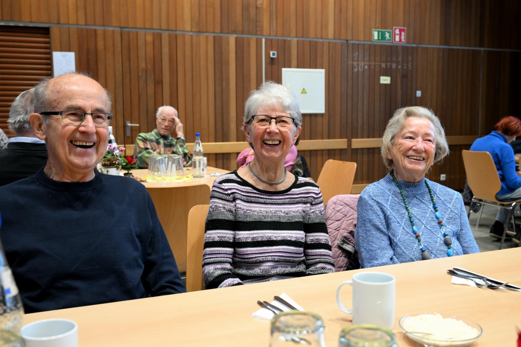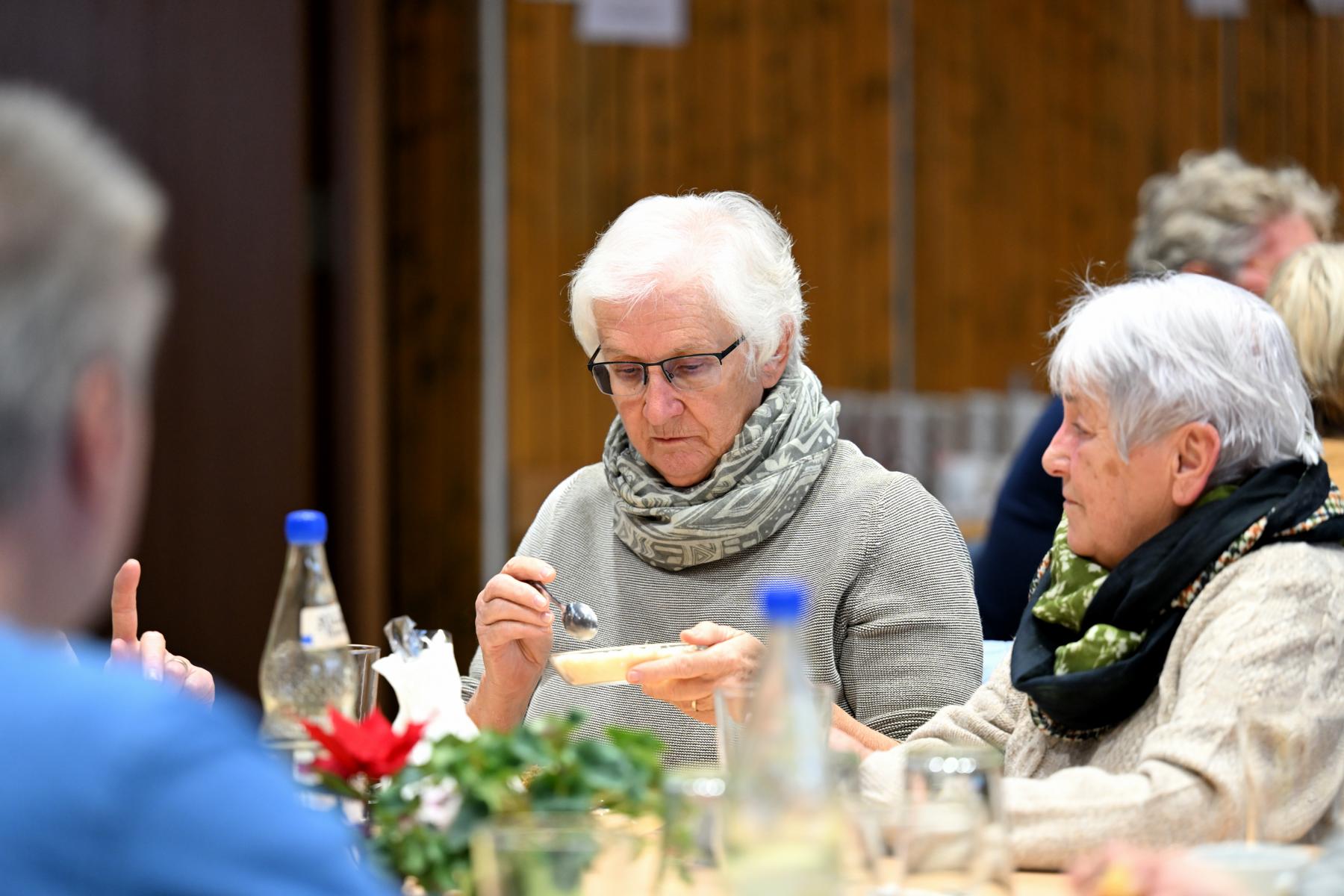 Und dann strömen die Gäste: Der Saal ist voll, das sind schon mal 110 Besucherinnen und Besucher (mit manchem „Nachschlag“ braucht es dafür ca. 150 Essensportionen), einige von ihnen warten, bis ein Platz frei wird.
