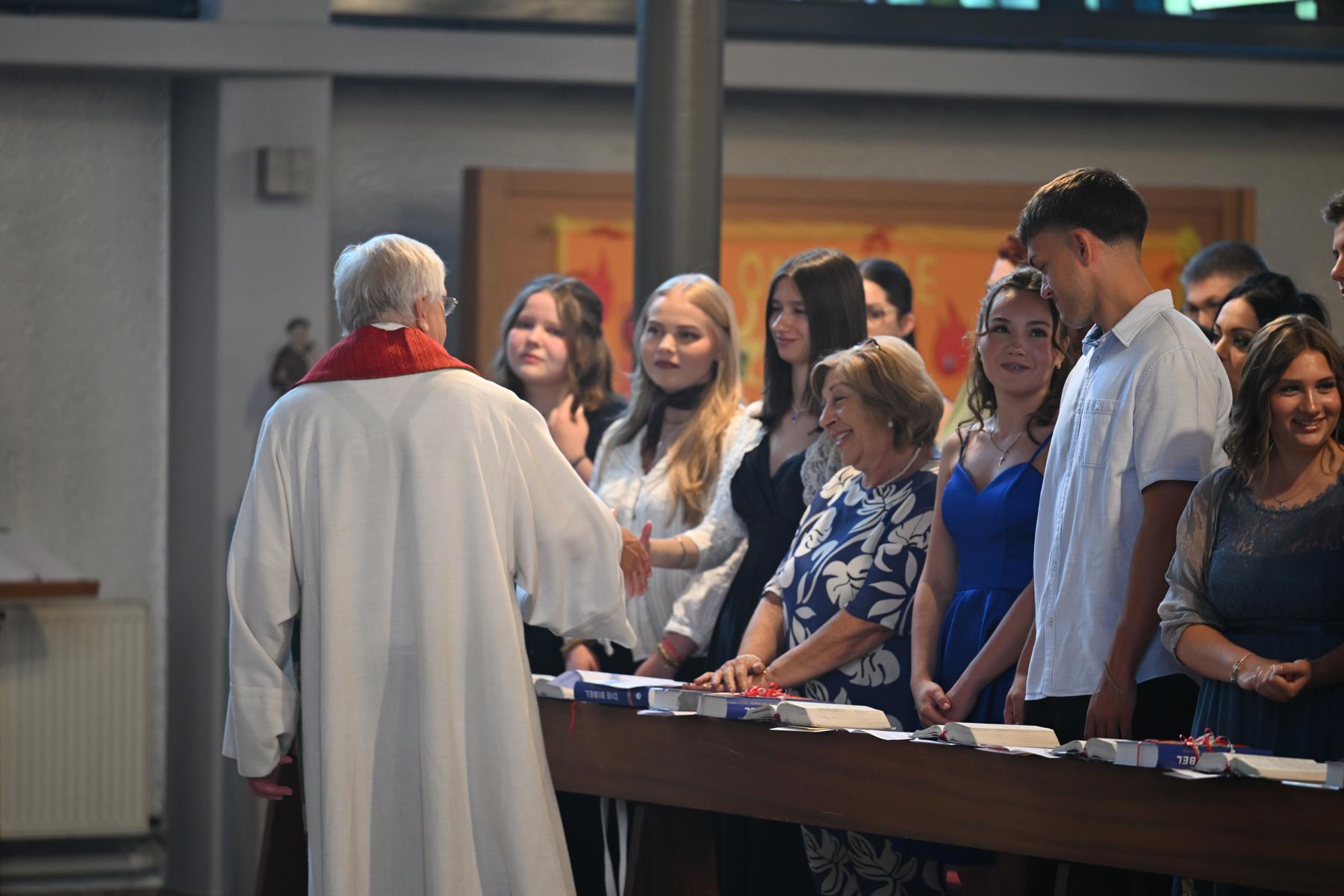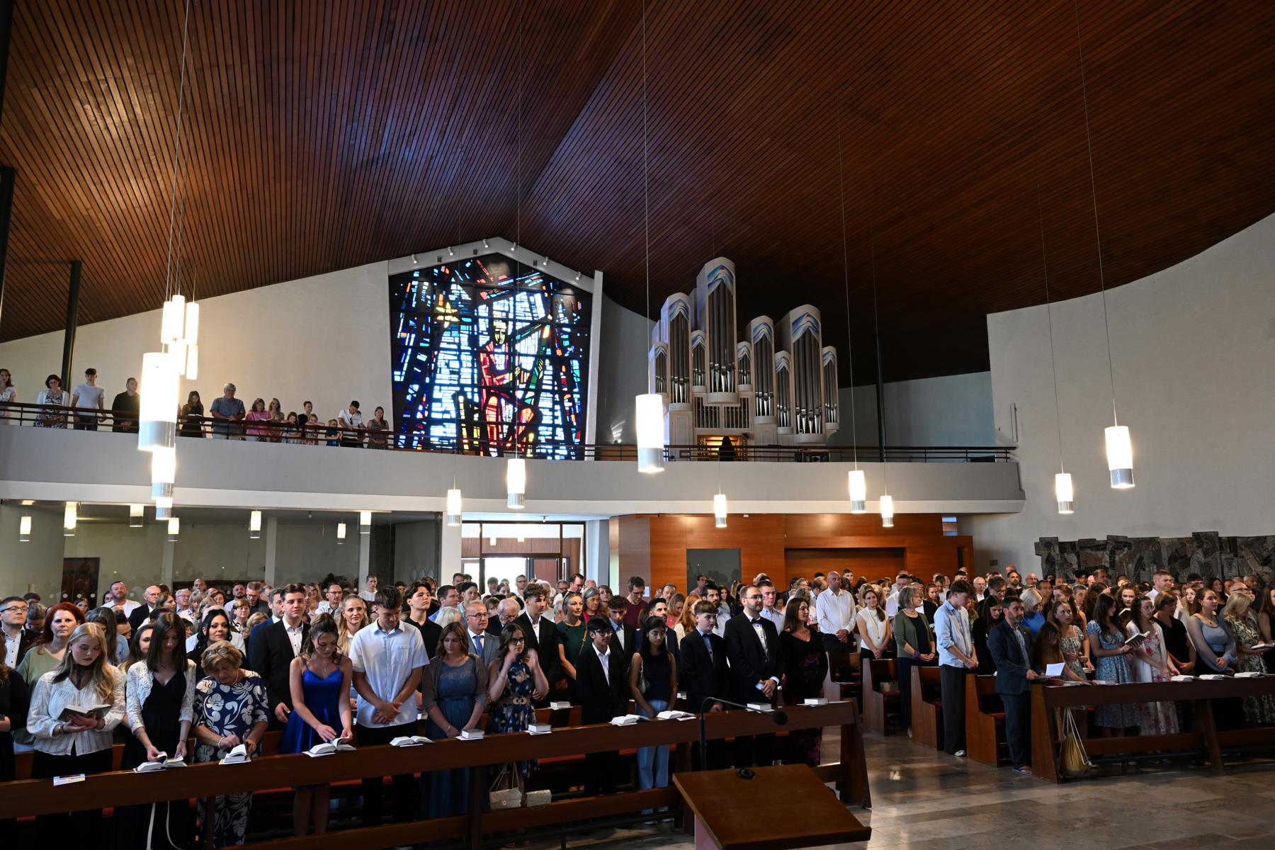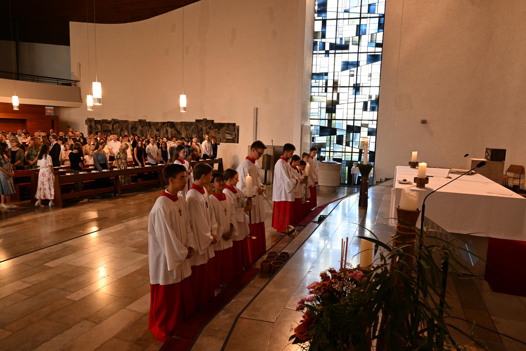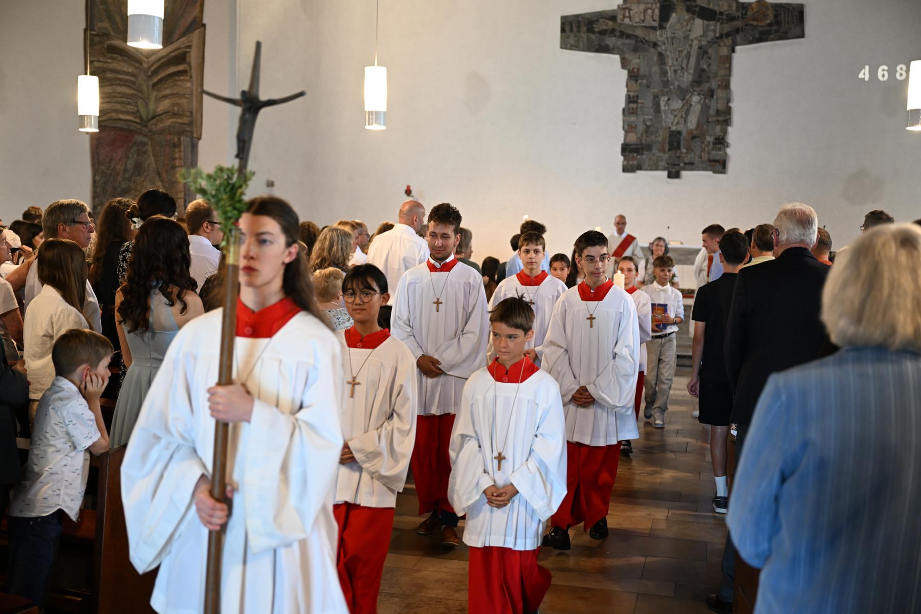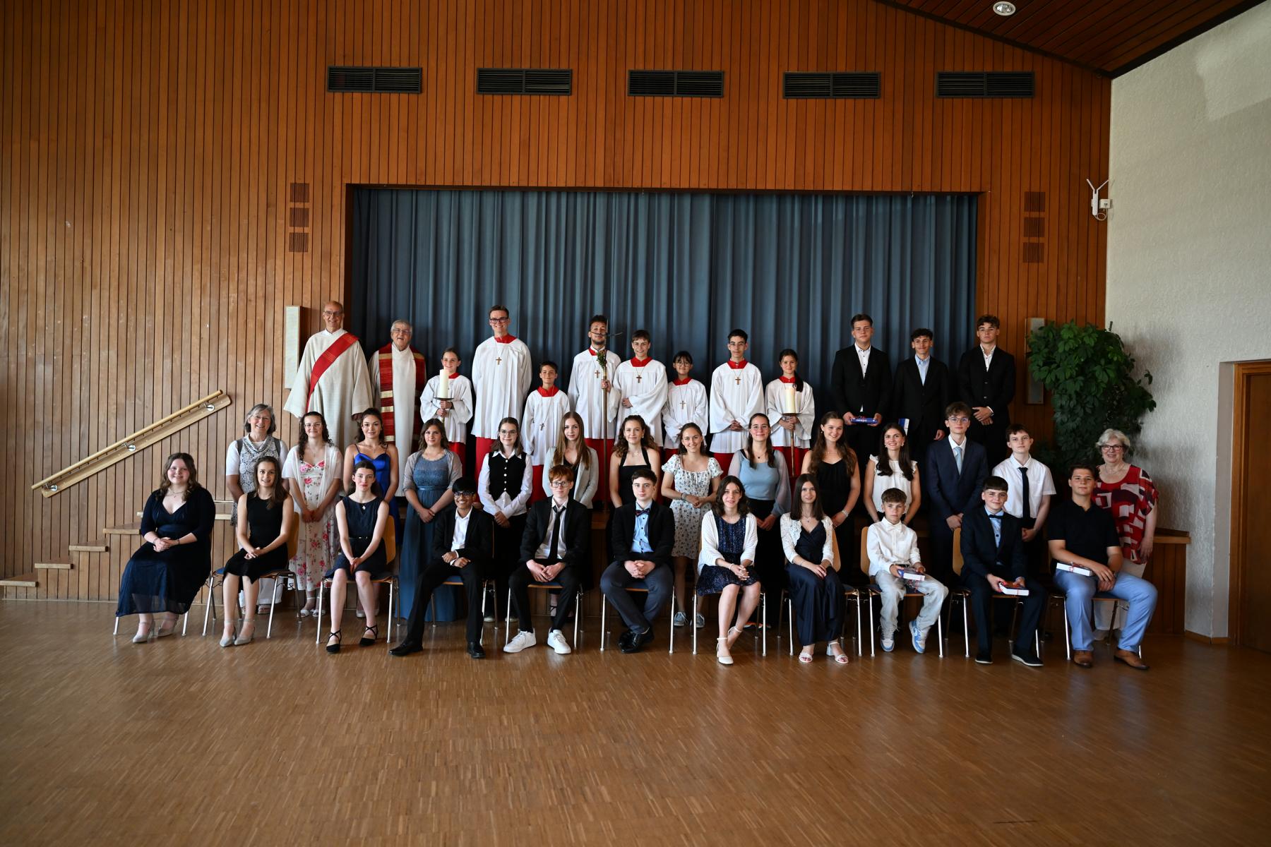 28 Jugendliche wurden in einem festlichen Gottesdienst am 16. Juli 2023 in der Christkönigskirche in Backnang von Pfarrer Wolfgang Beck gefirmt.