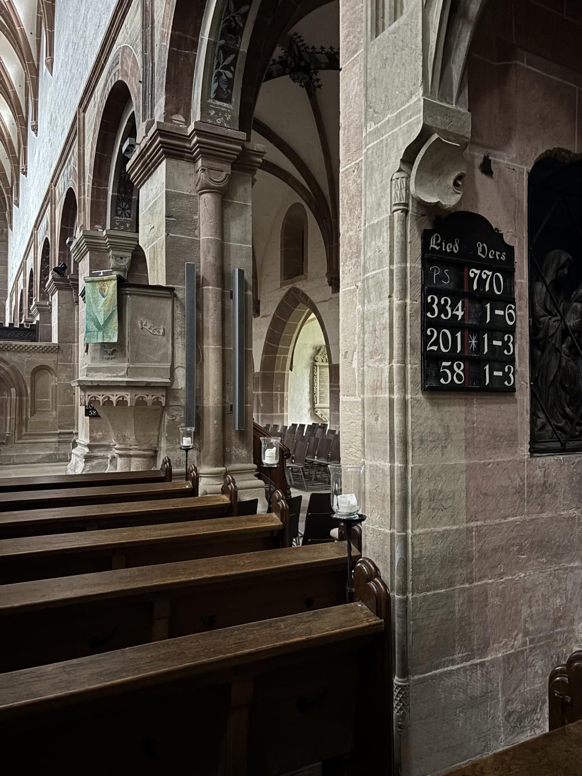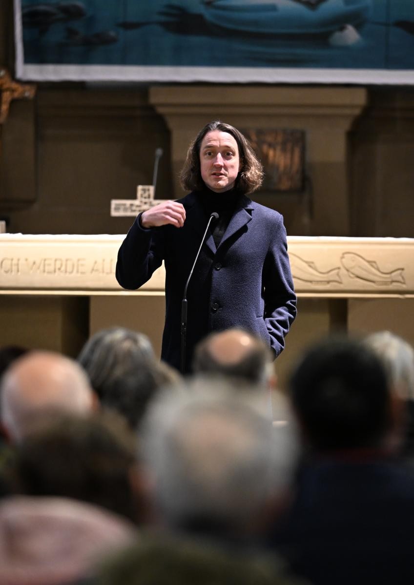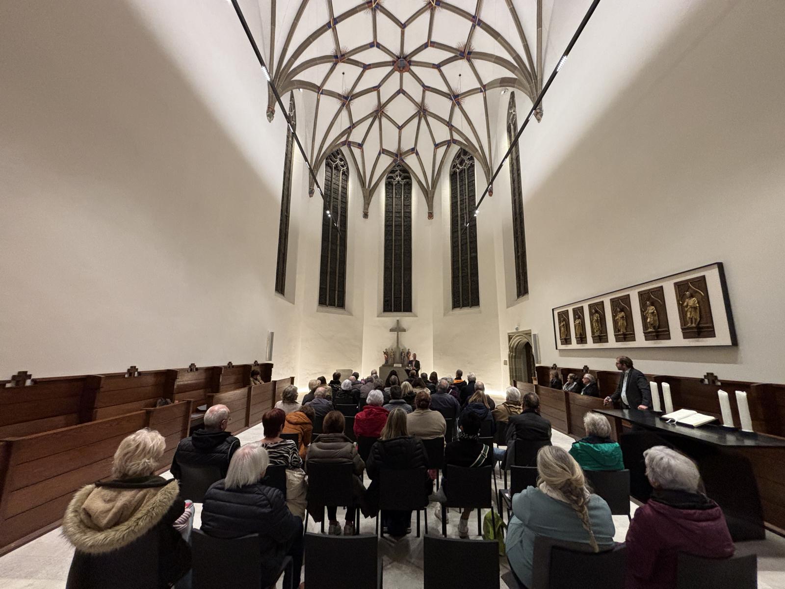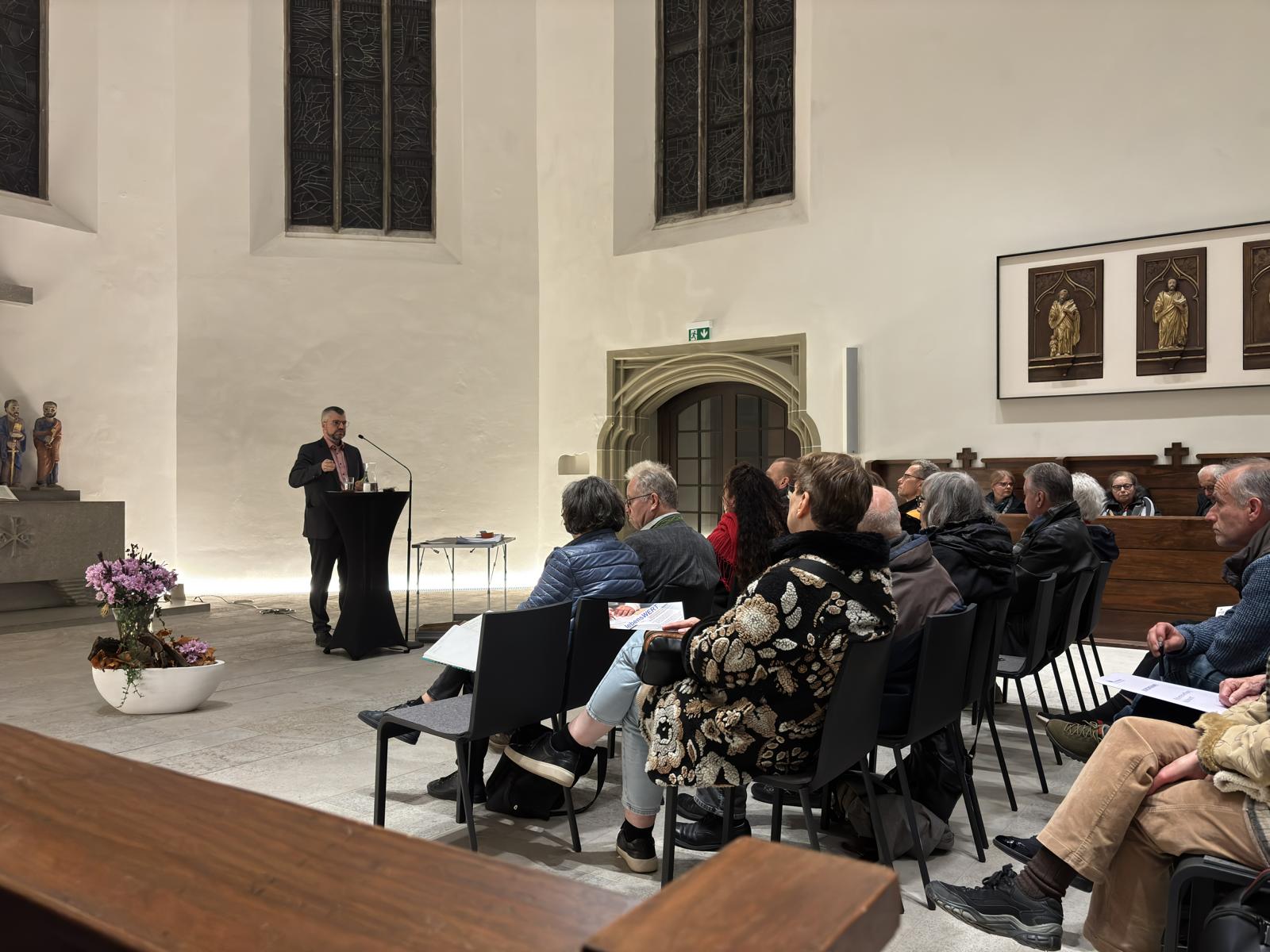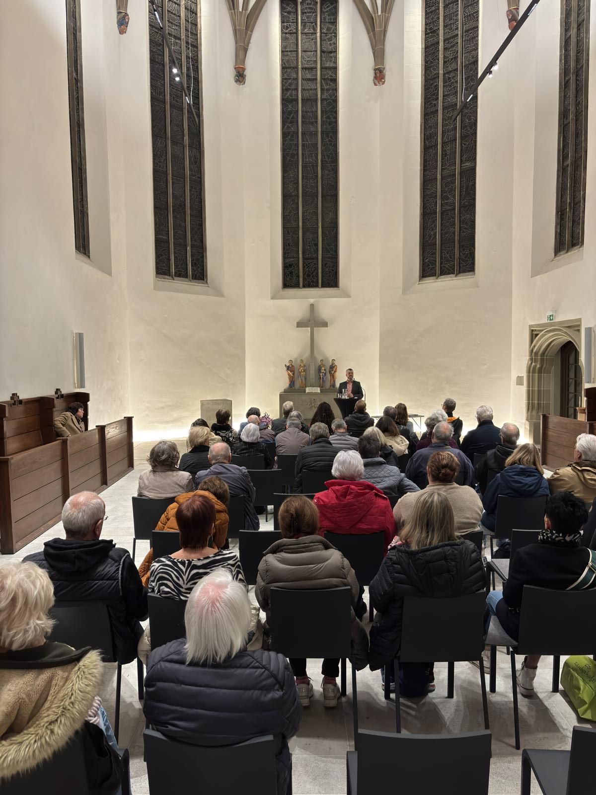 Etwa 50 an Antworten Interessierte begrüßte Pfarrer Thorsten Volz beim Vortrag zum Thema „Wissenswertes rund um die General- und Vorsorgevollmacht“ mit Notar Sebastian Frömel am 13.11.2025 im Chorraum der ev. Stiftskirche Backnang.