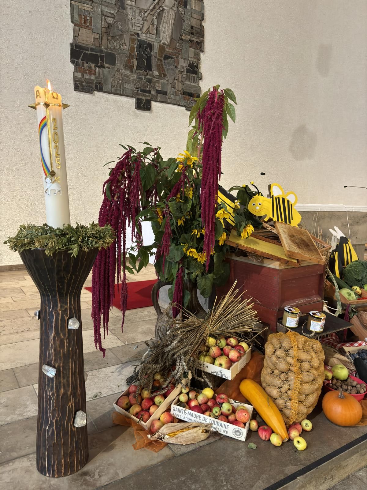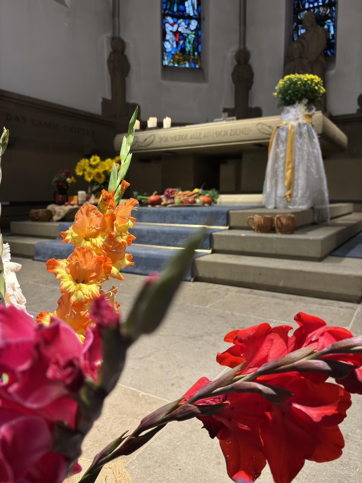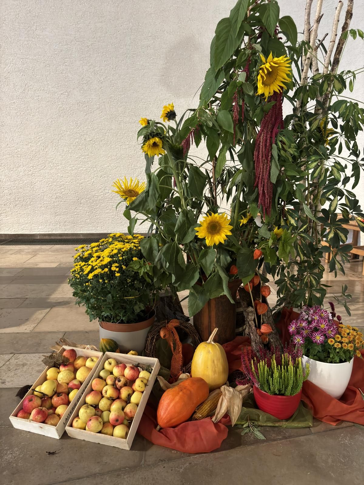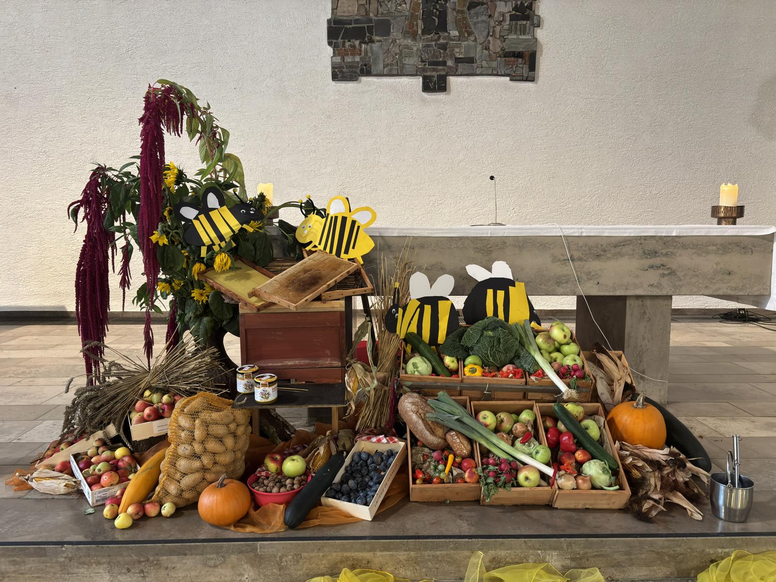 Wir sind dankbar für die wunderschönen Altäre, die unseren Reichtum an Erntegaben vor Augen führten. In der Christkönigkirche feierten die Kinder aus dem Kindergarten mit und zeigten mit fröhlichen Tänzen das Leben und Wirken der Bienen.