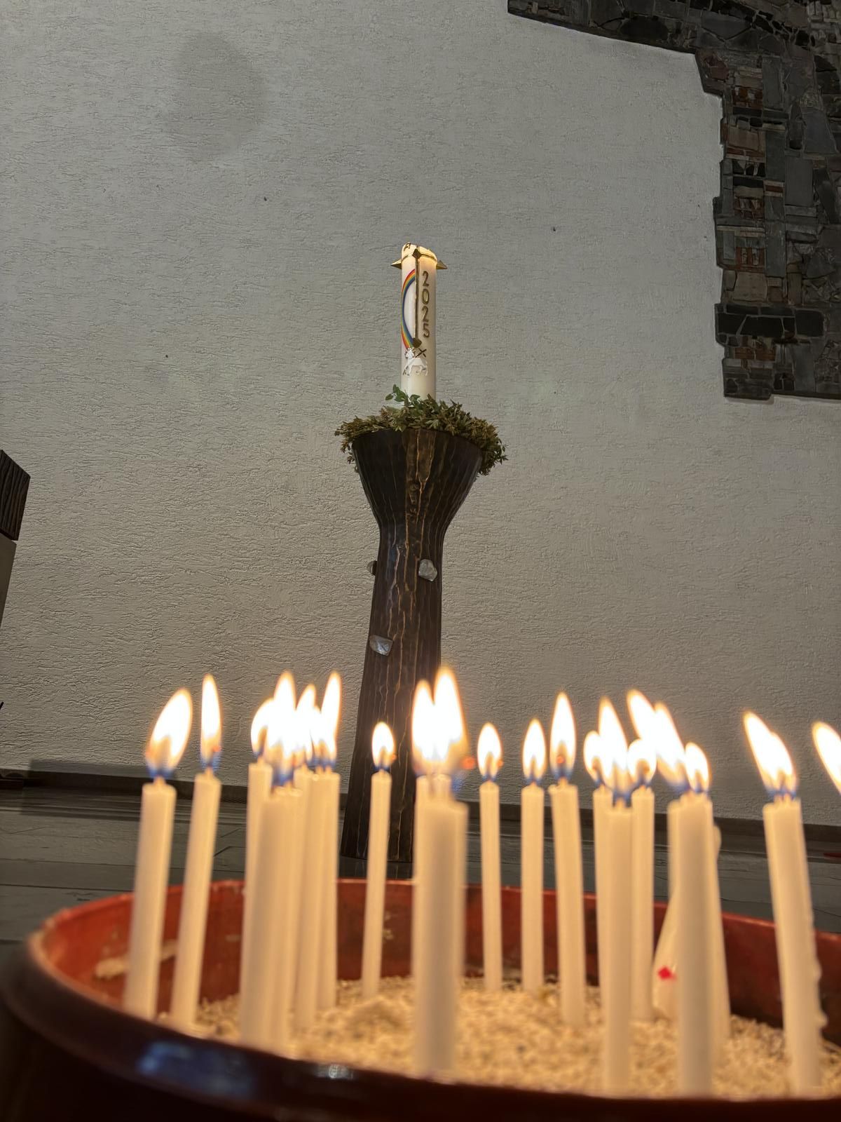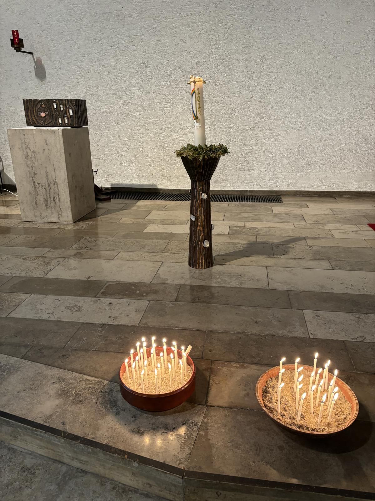 In der Vorbereitung des Pastoralberichts für die Anfang 2024 angekündigte Visitation (ein regelmäßig vorkommender Besuch des Dekans in allen Pfarreien) wurde ein Baum mit buntem Papier zum Leben erweckt: Welche Wurzeln haben wir, was ist der Stamm, der die Energie der Wurzeln in das Gemeindeleben bringt, welche Früchte haben wir, welche reifen noch, welche sind herabgefallen und nicht mehr am Leben. Das Bild zeigt einen viele Früchte tragenden Baum – dennoch gibt es auch manches „Fallobst“ und wir werden den Reifeprozess einiger Aufgabenbereiche im Auge behalten.