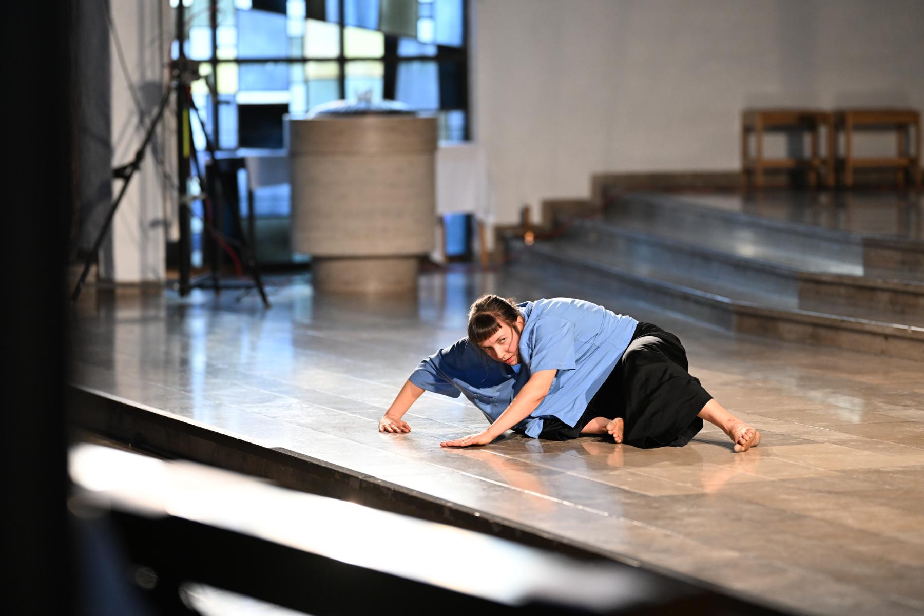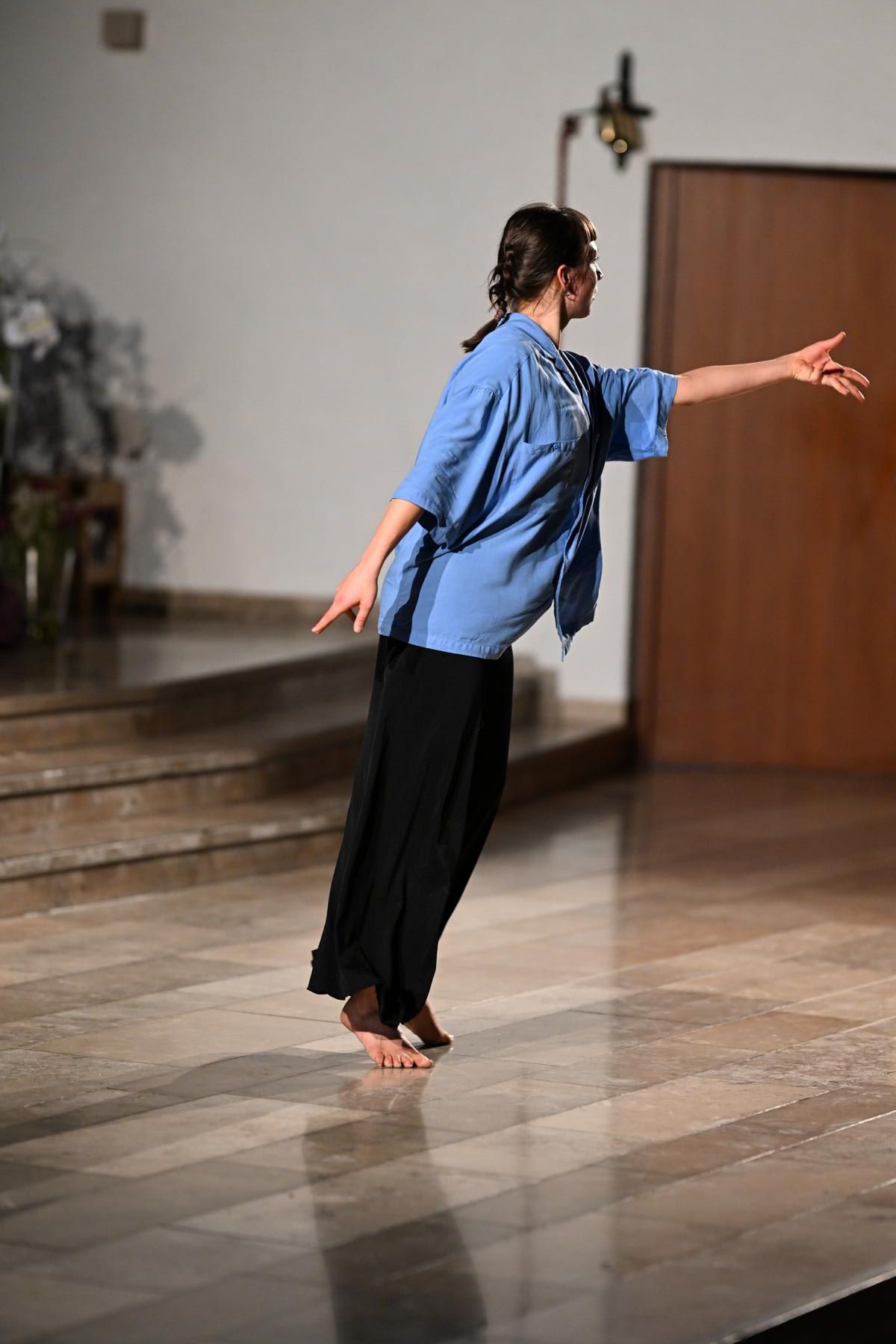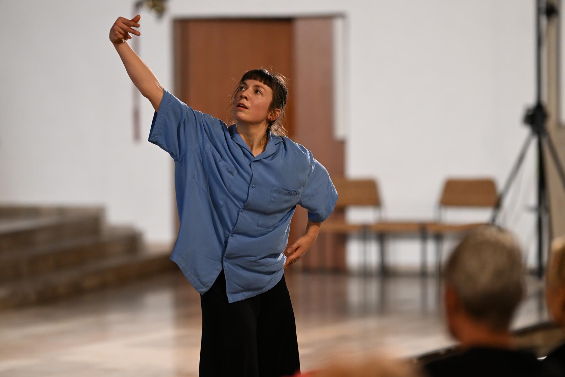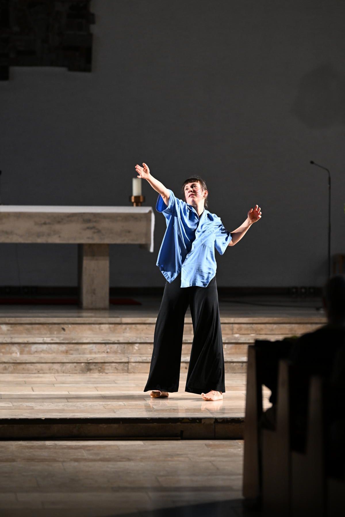 Die Raumerfahrung wurde dann durch den Ausdruckstanz von Martina Gunkel ganz neu aufgestellt. Das Publikum musste sich immer wieder drehen und wenden, um der Künstlerin zu folgen. Schon beim Eintreten in den Raum, von hinten durch den Mittelgang, nutzte Martina Gunkel den engen Weg, um der Musik mit ihrem Körper Sichtbares zu geben. Mit der Vielfalt der Musik konnte sie ihr wohl unendliches Reservoir an Gesten, Bewegungen und auch dem Innehalten mal direkt von den Zuschauern, dann wieder in der Distanz zeigen. Alles war improvisert, darum wurde der Zusammenhang mit der Orgelmusik besonders dicht – und natürlich einmalig. Dieses Tanztheater ist so nicht wiederholbar.